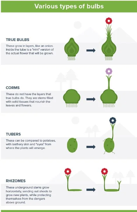 A bulb is any plant that uses an underground storage unit to carry it through its resting period and help it get to the next season. Bulbs can be broke down into various categories.